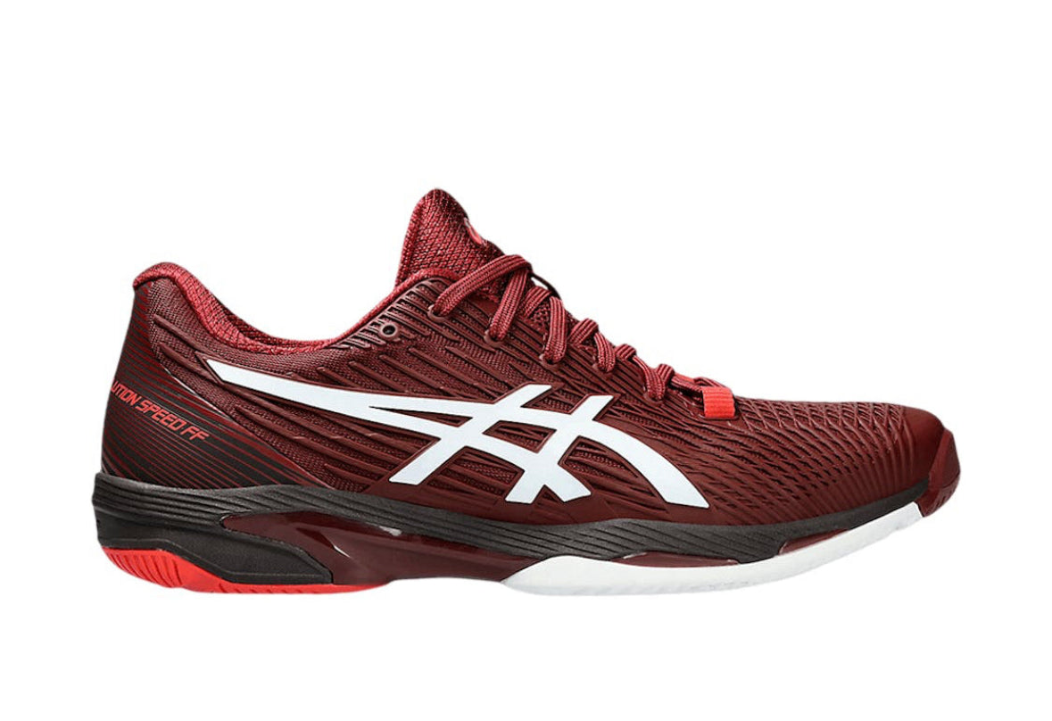The Solution Speed FF 2 “Antique Red” is a vibrant red‑and‑white tennis shoe released in 2023 (style code 1041A182‑602, nicknamed “Antique Red”). Engineered for agility and court speed, it features a polyurethane‑reinforced upper with DYNAWRAP and TWISTRUSS chassis for enhanced midfoot stability and swift lateral motion. Built with FlyteFoam cushioning and rear‑foot GEL for responsive comfort, it weighs just ~11.9 oz (336 g) in men’s size 9. Durable AHAR rubber outsole provides strong grip and wear resistance, while a breathable upper mesh ensures ventilation. Ideal for competitive players seeking a lightweight, stable, and fast tennis shoe.