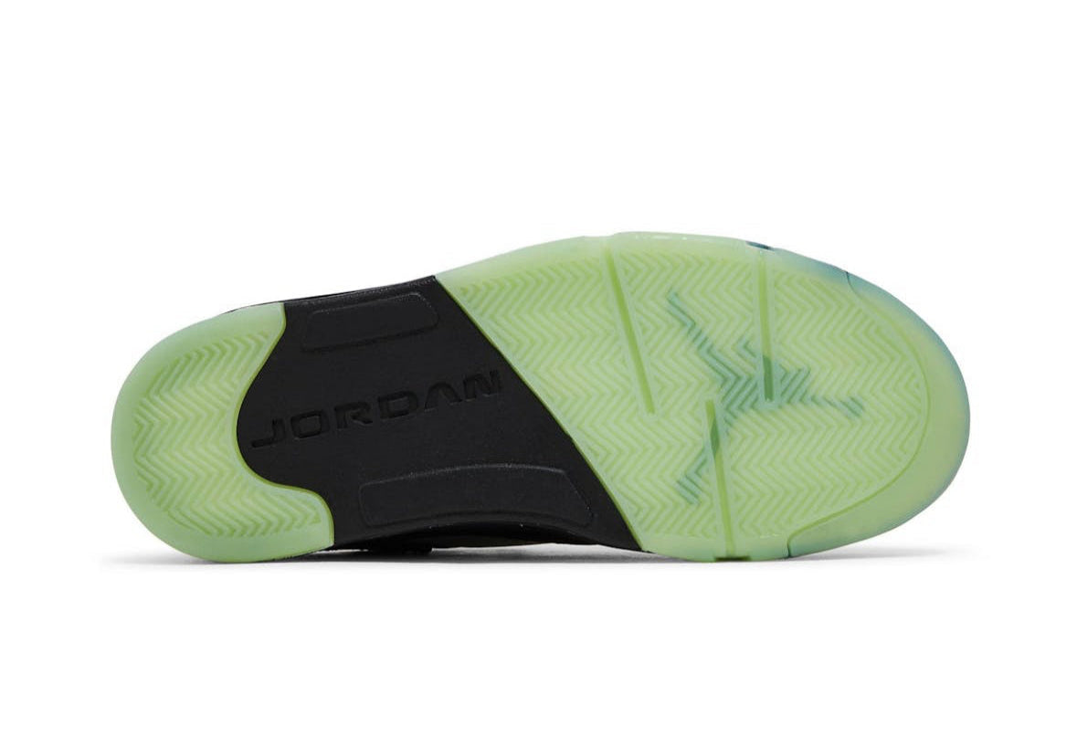 The CLOT × Air Jordan 5 Low “Jade” is a May 2022 collaboration honoring Chinese cultural heritage and Michael Jordan’s legacy. Exceptionally crafted with a sleek black satin upper, it features jade‑inspired glow‑in‑the‑dark translucent netting, lace lock, and outsole, along with jade beads on the laces. Metallic‑silver speckled shark‑tooth detailing and a reflective 3M tongue nod to classic AJ5 cues. Red accents—on the sockliner, laces, Jumpman logo, and insole patterns—evoke traditional red strings worn with jade for luck. The heel displays CLOT branding and the number “23” in embroidered Chinese characters. Retail was USD 200.