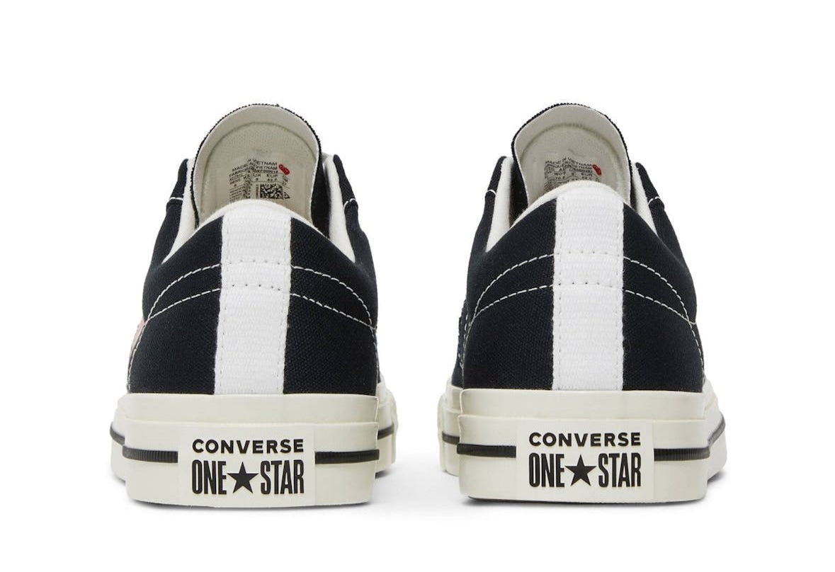 The Comme des Garçons PLAY x Converse One Star Black White is a sleek, minimalist sneaker that blends Converse’s classic design with CDG PLAY’s playful aesthetic. Built on the iconic One Star silhouette, it features a premium black canvas upper with a contrasting white midsole and laces for timeless appeal. The standout detail is the signature red heart logo with eyes, designed by Filip Pagowski, peeking just above the midsole on the lateral side. Durable rubber soles provide everyday comfort and traction, while subtle co-branding elevates its exclusivity. A versatile sneaker, it balances streetwear edge with refined designer flair.
