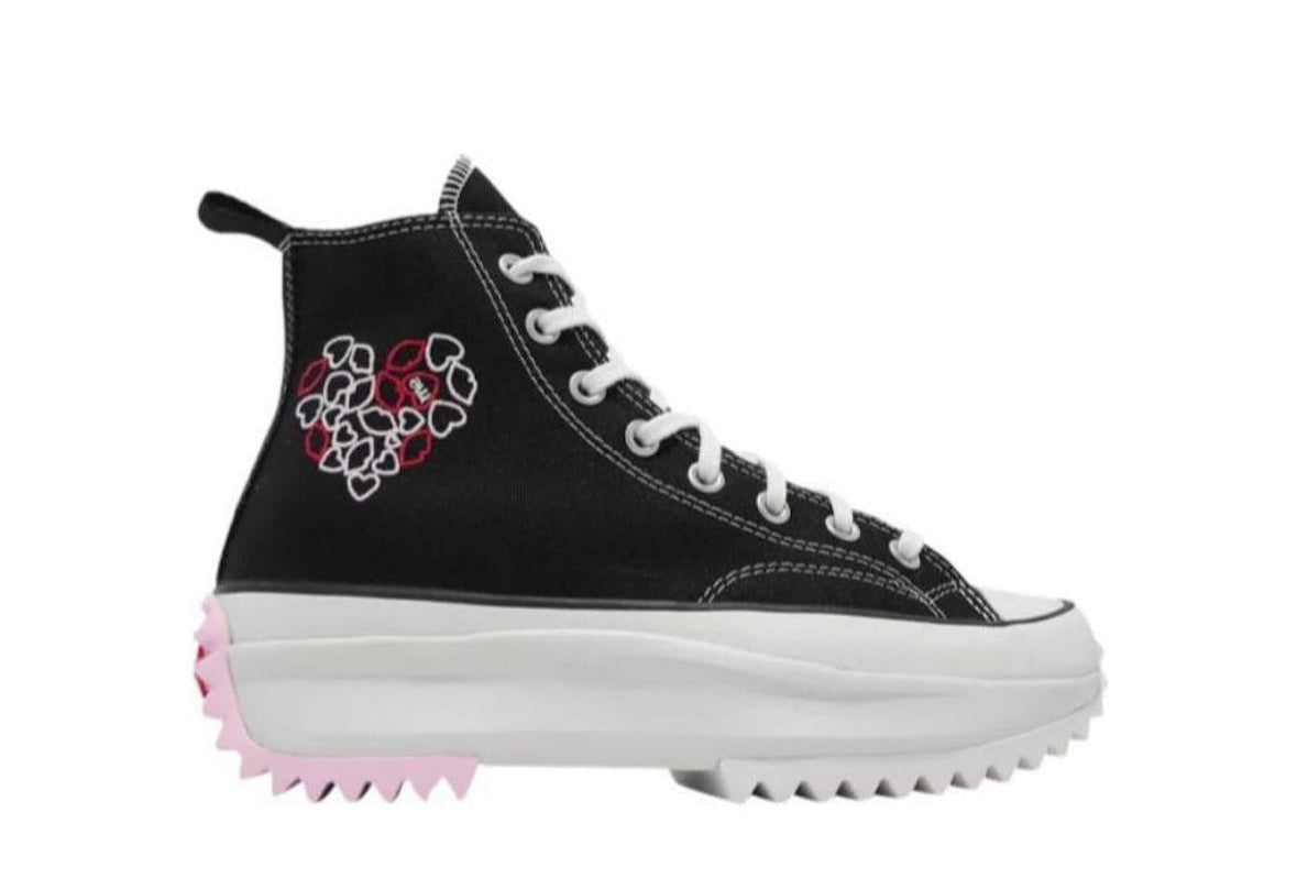 The Converse Run Star Hike High Valentines "With Love" is a bold twist on the classic Chuck Taylor, reimagined with romantic flair. Designed for Valentine’s Day, it features premium canvas uppers decorated with playful heart graphics and love-inspired detailing. The signature exaggerated platform midsole and jagged rubber outsole bring height and modern edge, while classic Converse elements like the All Star patch keep its heritage intact. A cushioned insole provides comfort, making it as wearable as it is stylish. With its mix of sweet design and standout construction, this pair perfectly blends love-themed creativity with Converse’s iconic streetwear legacy.