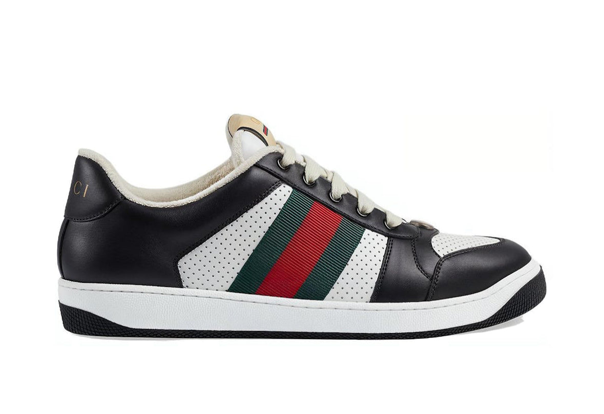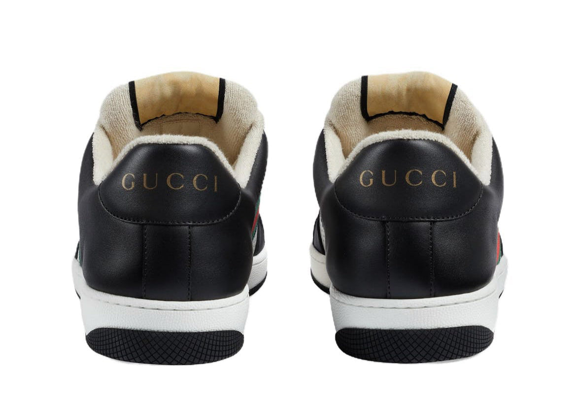 The Gucci Screener Black White is a vintage-inspired low-top sneaker that blends retro aesthetics with modern luxury. Crafted from smooth black and white leather with suede overlays, it showcases Gucci’s signature distressed finish for a worn-in look. The design features the iconic green and red Web stripe on the sides, a perforated toe box for breathability, and subtle Gucci branding on the tongue and heel. A rubber sole enhances comfort and grip, while the aged effect gives it a nostalgic 1970s feel. The Screener perfectly captures Gucci’s mix of heritage sportswear and high-fashion street style.