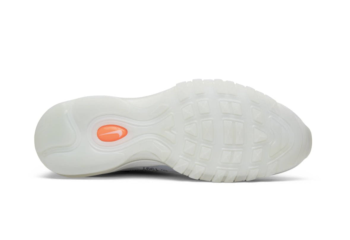 The Off‑White × Nike Air Max 97 OG “The Ten”, designed by Virgil Abloh for the 2017 The Ten collection, reimagines the classic ’97 silhouette with a translucent, minimalist upper that softens its iconic ripple lines and emphasizes the shoe’s shape. A bold black Swoosh on the lateral side and a large “AIR” printed in quotation marks above the full-length visible Air unit nod to both innovation and Off‑White’s signature industrial aesthetic. Additional details include the bright orange tab next to the Swoosh, “SHOELACES” printed on the laces, and the red zip tie branding. The result is a sculptural, deconstructed rework of a 1997 icon that blends streetwear with architectural art.