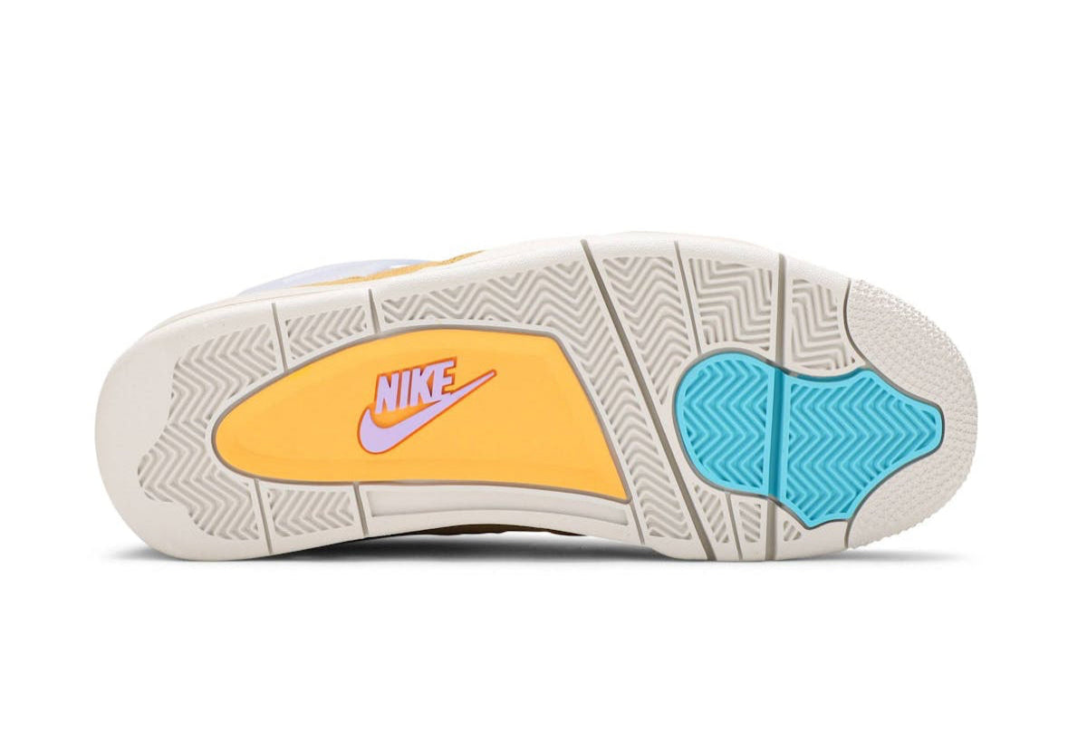 The Union LA x Air Jordan 4 Retro “Desert Moss” is a striking Jordan Brand collaboration, released in June 2021 for Union’s 30th Anniversary as part of the “Tent and Trail” capsule. It features a Desert Moss mustard‑yellow suede upper overlaid with bright purple mesh on the collar and toe box, accented by turquoise eyelets and heel tab with lavender Nike Air branding. The folding, stitched-down tongue wears a signature yellow UN/LA tag, while translucent TPU wings add structure. It’s all set on an off‑white polyurethane midsole with an aqua‑tinted Air unit under the heel, blending retro silhouette with earthy outdoor hues.
