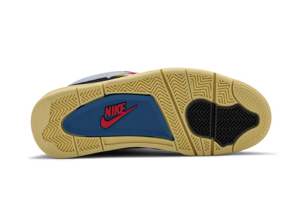 The Union LA × Air Jordan 4 Retro “Off Noir”, A standout release from August 2020, this collaboration channels vintage ’80s‑’90s vibes through bold material contrast and unconventional details. The upper blends plush black suede and breathable black mesh across the toe box, with vibrant “Brigade Blue” collar mesh adding pop. Semi‑translucent wings sit over red molded eyelets, and the tongue is intentionally flipped-down to showcase the “Air Jordan” branding on its interior—an artistic nod to Chris Gibbs’ childhood styling. A yellowed “sail” midsole with visible AIR cushioning and contrast stitching enhances the thrifting‑inspired aesthetic, while a ‘UN/LA’ tag on the sidewall cements the creative collaboration ethos