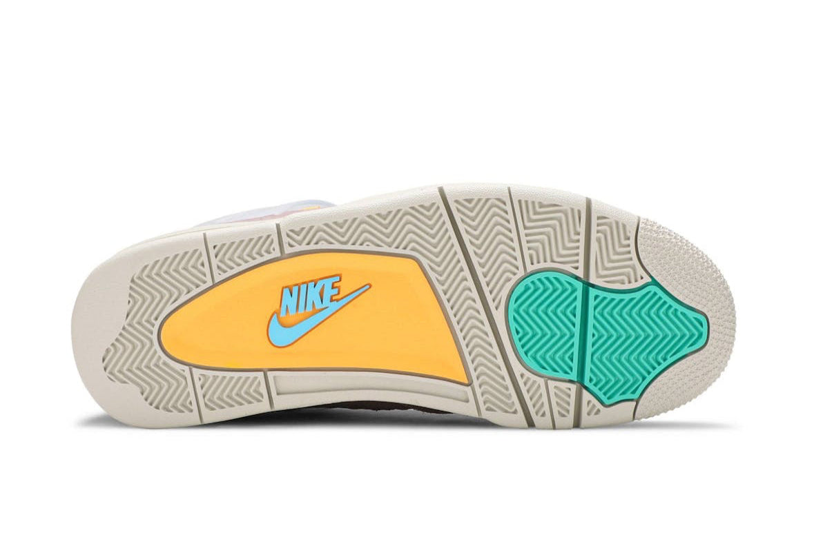 The Union LA x Air Jordan 4 Retro “Taupe Haze”. A standout collaboration celebrating Union LA’s 30th anniversary, the Jordan 4 “Taupe Haze” merges outdoor‑inspired aesthetics with premium craftsmanship. Its taupe suede overlays meet breathable tan mesh panels, accented by translucent TPU wings and co‑branding details like UN/LA lateral tags and pre‑folded, road‑sign‑shaped hangtags stamped “1991‑2021” Pops of Roma Green, Blue Fury, and Khaki enliven the eyelets, heel tab (with raised Nike Air), and collar lining. Underfoot, an off‑white polyurethane midsole shelters an aqua‑tinted Air unit riding atop a sail rubber outsole. Launched June 20, 2021 via Union LA raffles and selected resellers, this pair retails around $225 USD